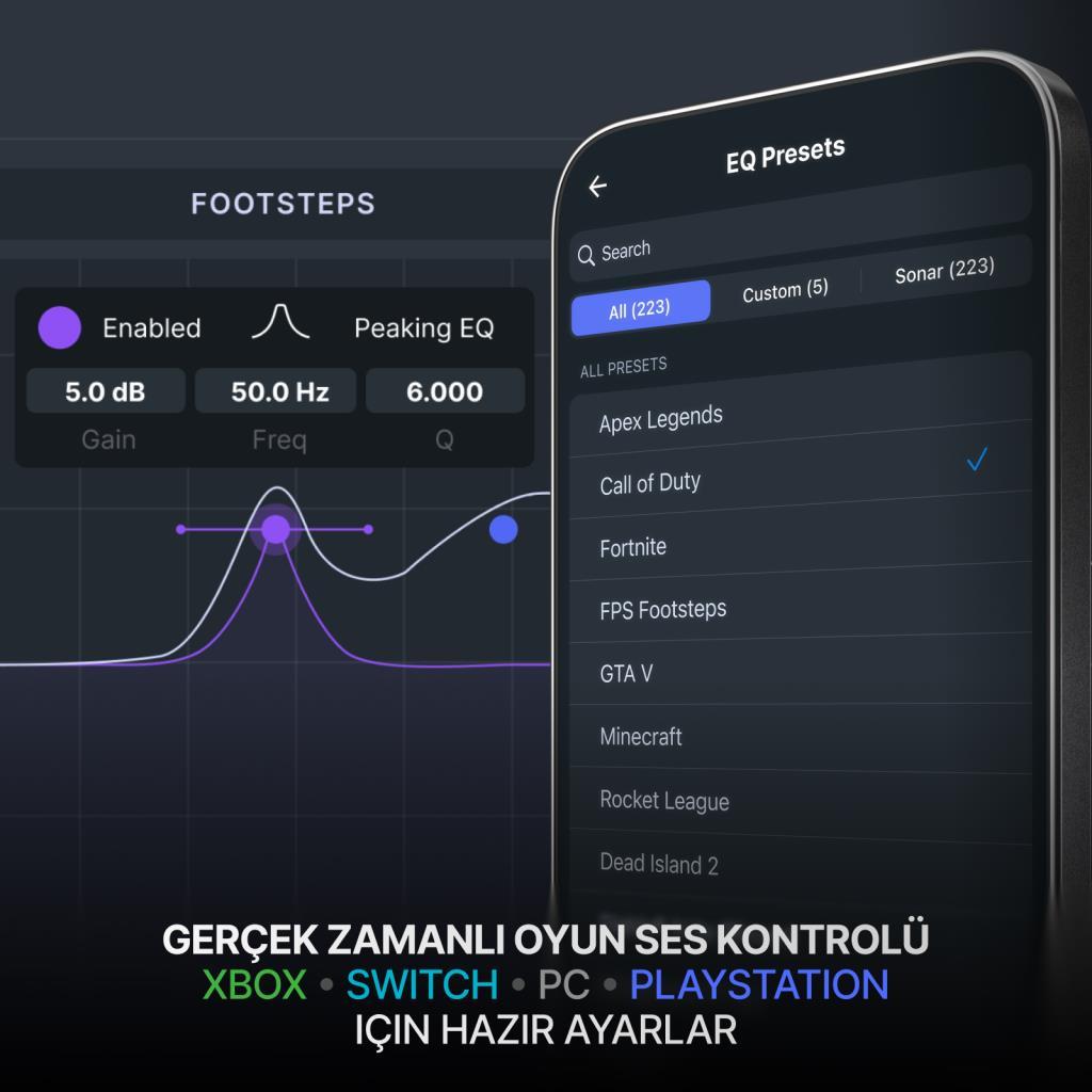 - Call of Duty, Fortnite ve diğer oyunlarda ayak seslerini daha iyi duyabilmek için ön ayarlar, mobil uygulama üzerinden kontrol edilir